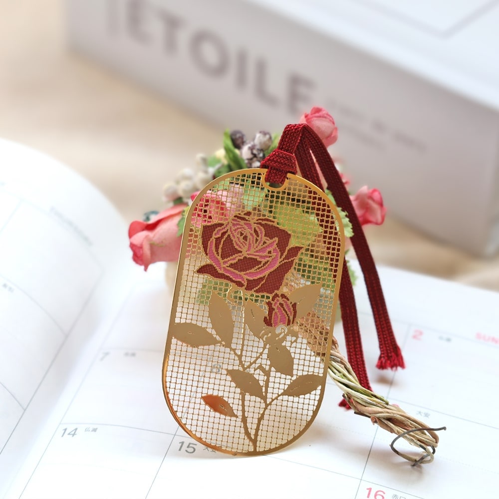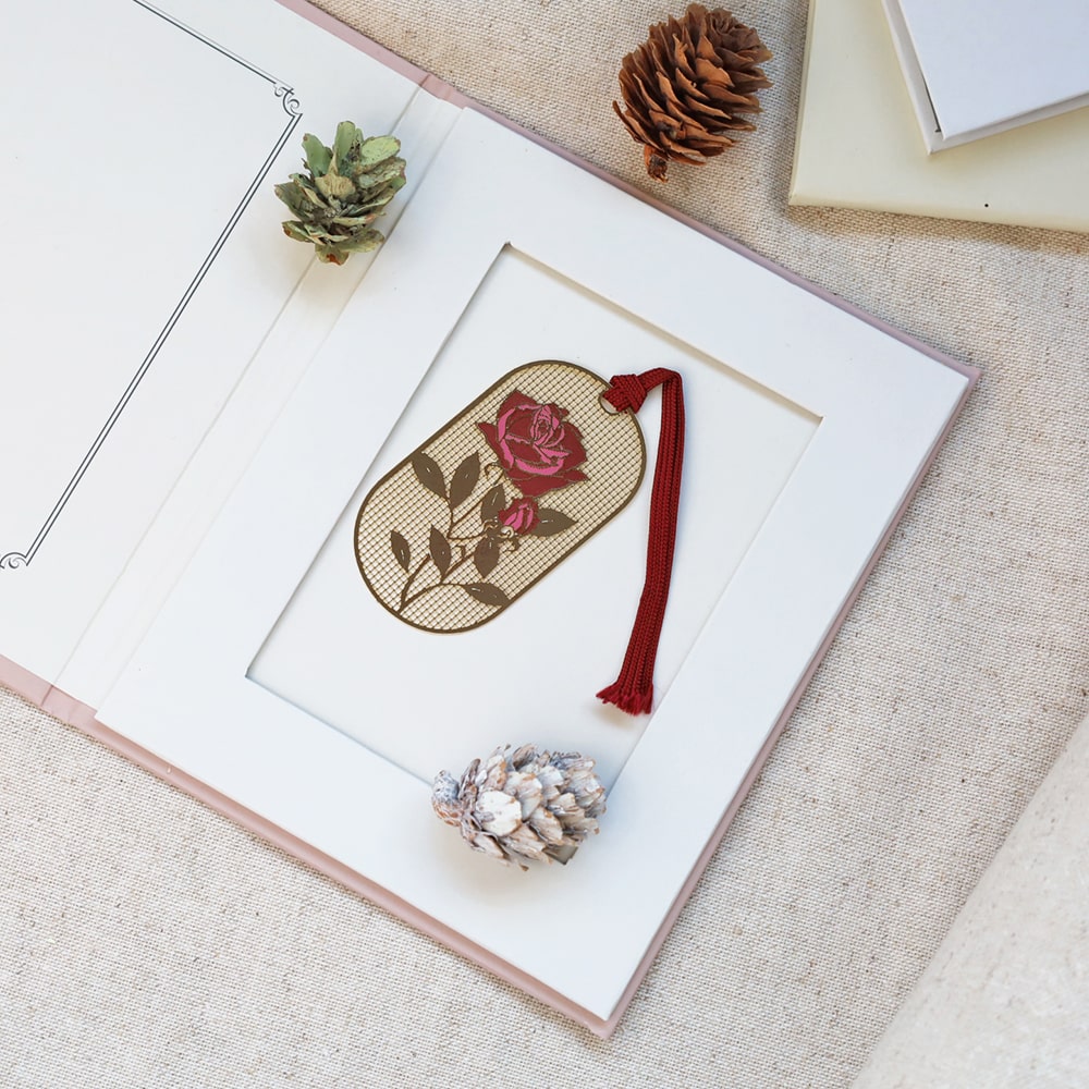 繊細なデザインとゴールドの輝きが美しいしおりです。