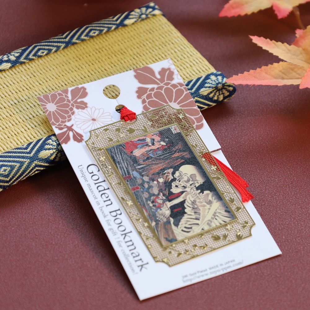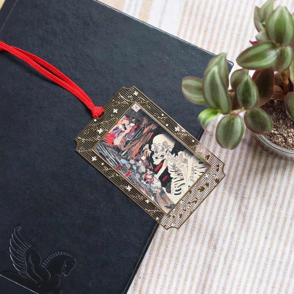 骸骨が現れる迫力ある場面を繊細に表現し、読書時間に和の美と妖しさを添えます。
